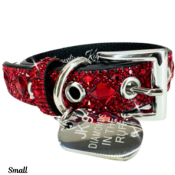 Add a touch of drama to your dog’s wardrobe with the Ruby Red Crystal Dog Collar by Jacqueline Kent. Overflowing with sparkling aurora borealis crystals, this dazzling collar is made for pups who love the spotlight. Backed with comfortable faux leather and available in three adjustable sizes, it’s perfect for dogs of all breeds and sizes.